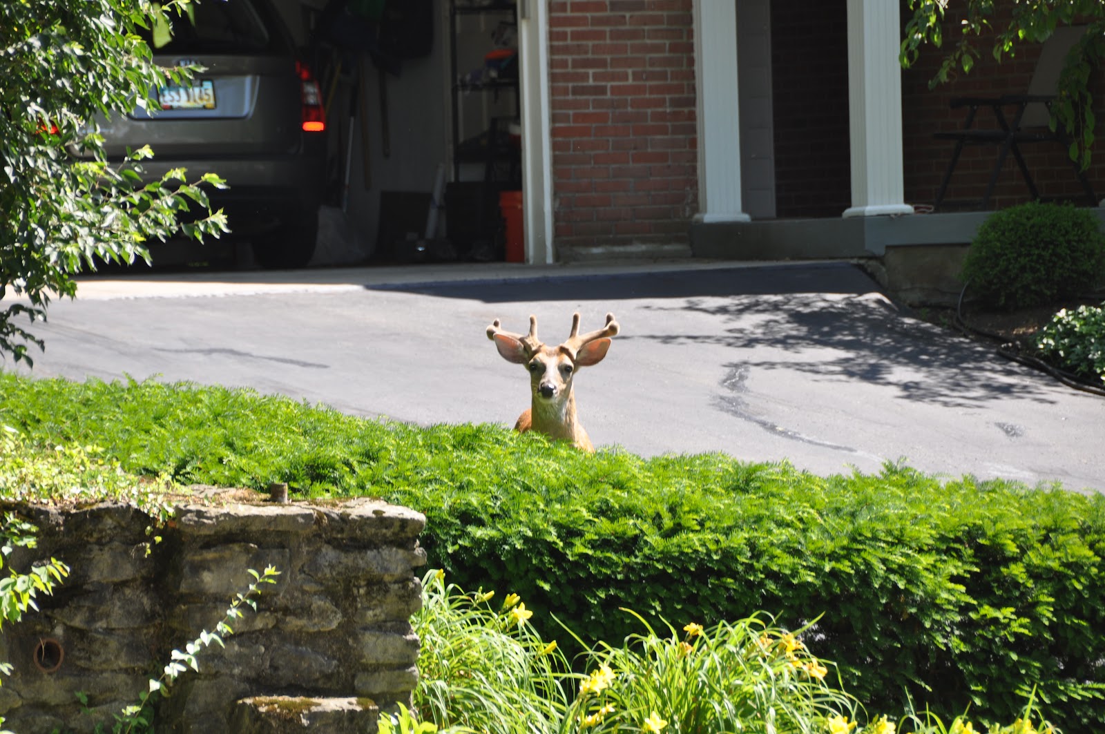 ...so had I stopped to think the other day, I would have realized that the deer I saw HAD to be "Doris" because the males would already have their antlers by now, even if not fully grown. It wasn't until I saw "Boris" and "Horace" in our neighbor's front yard earlier that it became quite obvious. I was going to crop the pictures to get rid of the extraneous visual clutter in the images, but then I decided not to because I thought it was more interesting to see these creatures living amongst us. Stay tuned---Allie saw a fawn earlier with all of its white spots---I keep looking out the front door, but no sightings yet. Maybe when everyone turns off their lawn mowers...
